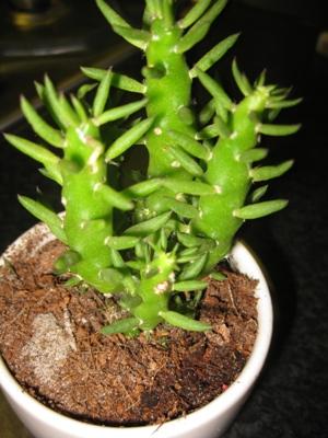 Ja dat is Cylindropuntia of Austrocylindropuntia subulata, volgens mijn ervaring is dat een prima onderstam voor Schlumbergera, maar ook voor opuntiaachtigen zoals Maihueniopsis clavarioides (negerhandje), Tephrocactus papyracanthus, ook de witte vorm van Opuntia microdasys oogt mooi, geënt op een hoog stammetje. ik heb altijd een aantal planten van Austrocylindropuntia subulata, die ik speciaal kweek voor die dinges op te enten. Ik plant deze uit in een 10 à 12 cm pot en zet ze op een lichte plaats zodat ze mooi rechtopgroeien en wanneer ze een dikte hebben van 3 à 4cm gebruik ik ze om te enten. het bovenste stukje dat ik er af snij is ongeveer 6cm lang, en nadat de snijwonde geheeld is bewortel ik dat om het later opnieuw te gebruiken. Vriendelijke Groet,