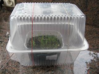 Er kunnen juist 2 plastieken bakjes van aardbeien of zo ingezet worden , zodat er 2 verschillende zaaisels kunnen opkomen op de vensterbank - ik hou ze samen met een gewoon elastiekje en zet er een onderlegger onder zodat ze geen koude voeten hebben - 's avonds neem ik ze van de vensterbank omdat het achter de gordijn te koud is in de winter .Lukt prima - en nu allemaal konijn gaan kopen !