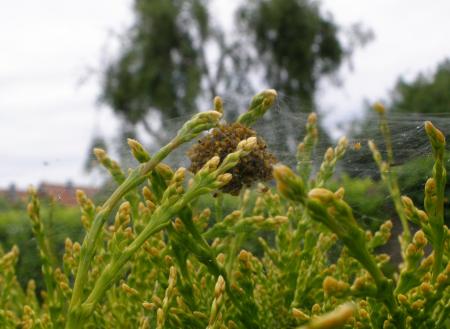 Volgens mij is dat een nestje jonge kruisspinnen. met al die dunne draadjes vatten ze de wind en verspreiden zich aan dat draadje door de lucht.