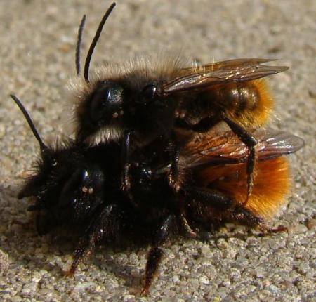 Geen hommels maar metselbijen, vermoedelijk Gehoornde metselbij, zie: