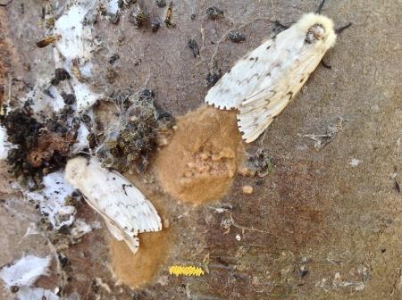 Wat bevind zich vlak achter de vlinder? (bruin pluisig spul met eitjes?)