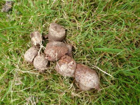 Zonder meetlatje en omschrijving vindplaats (stad, platteland, provincie) moeilijk te bepalen. De uitwerpselen zijn ook al ingedroogd en kunnen ook wel braakballen zijn van velduil of torenvalk.
