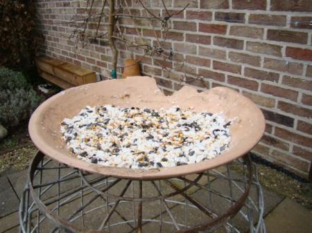 - strooivoer op de grond - vetbollen in de krentenboompjes - oude terracottaschaal met