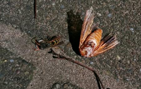 Dat bleek een insect te zijn wat met z'n vleugels fladderde in een poging weg te komen van een wesp. Deze wesp zat op zijn hoofd en op een gegeven moment had de wesp het insect onthoofd.. Daarna ging de wesp iets met het hoofd doen, wat ik niet zo goed zag.