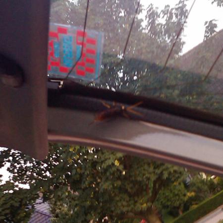 de insect die jullie kunnen zien op de meegestuurde afbeelding zat afgelopen week in mijn auto. Ik ben benieuwd of een van jullie mij kan vertellen wat voor een insect dit zou kunnen zijn? Lengte is ongeveer 5 tot 7 cm inclusief gele 'voelsprieten'. Het lichaam was dik en rond, en het kon vliegen.
