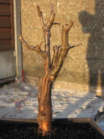 Hierbij een afbeelding van mijn krulhazelaar, die ik vandaag uit mijn tuin heb gehaald en in een tijdelijke trainingsschaal heb gezet. Ik had hem al bijgesnoeid toen ie nog in de volle grond stond; hij had inmiddels voldoende haarwortels gevormd om hem in een schaal te plaatsen, vandaar.