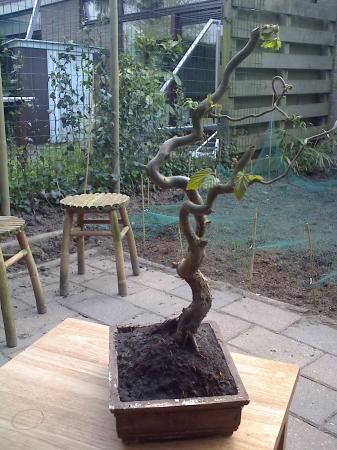 van de kronkelhazelaar op foto... ziet er niet 'slecht' uit he zo op het eerste zicht, maar als je eerlijk zou moeten doorkijken naar de bonsai erin...weet toch niet zo goed, ik zie daar geen structuur is, het is een bos gekrulde takken he, ziet er wat sprookjesachtig uit maar om nu te zeggen dat daar veel aan gevormd is, behalve de stam begeleiden...