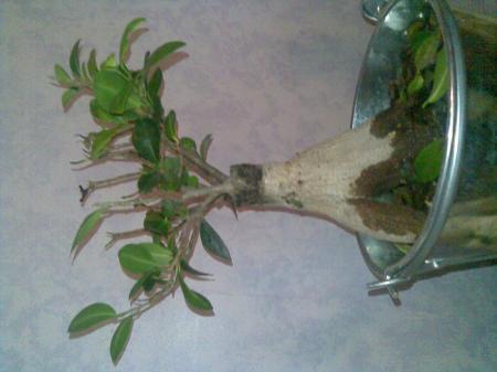 Deze ficussoort is waarschijnlijk ten dode opgeschreven doordat de wortelkluit echt veel te nat is. Een gevolg daarvan is datgene wat zich nou dus voordoet en dat is wortelrot. Doordat de aanwezige grond dichtslibt gaan de wortels rotten/afsterven zodat de plant uiteindelijk sterft.