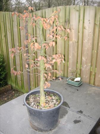 Bedankt voor alle reacties! Het is inderdaad lastig om van een foto een boom te beoordelen en advies te geven wat het snoeien betreft. Het is inderdaad ruw beginmateriaal maar dat vind ik een leuke uitdaging. Ik ga hem inderdaad een stuk korter snoeien en kijken wat hij zometeen in de lente gaat doen. De bak is opzich redelijk geschikt voor trainingpot omdat de drainage geen probleem is. Na de snoeibeurt en het uitlopen zal ik wel enkele foto's plaatsen. Nogmaals bedankt voor de reacties!