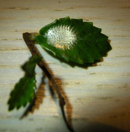 Twee weken verder is het schubvormige groeisel nauwelijks veranderd, hooguit iets groter geworden. Bij vergroting onder een stereomicroscoop lijken het afzonderlijke cellen te zijn, waarvan een gedeelte nu een smalle opening toont. Vermoedelijk is het een soort eikapsel en zijn er inmiddels kleine hummeltjes uitgekropen, die wellicht de hapjes uit de blaadjes kunnen verklaren. Gelukkig zit deze dreumis iep na de snoei goed in de nieuwe blaadjes, zodat ik misschien binnenkort hier nog een vervolgmelding kan doen.