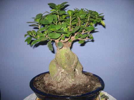 Dit is een Ficus soort die heel snel een dikke stam en wortel ontwikkelt, zodat het 'bonsai' effect binnen 4/5 jaar bereikt is. Vervolgens is de hoofdtak teruggesnoeid en snel weer uitgelopen. Dat maakt het voor mij nog niet tot een bonsai.