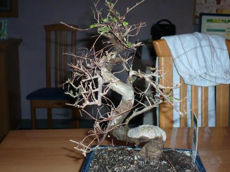 Om welke soort het gaat, is moeilijk vast te stellen, zo zonder blad. Het lijkt me een buitenbonsai, die het in huis veel te warm en te donker vindt.