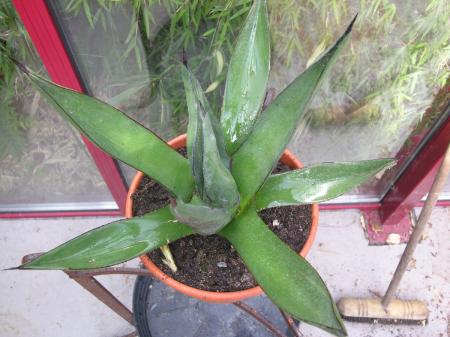 Nadat ik de laatste keer bij een nieuw verworven Agave niet verder kwam dan het genus, hoop ik dat jullie me deze keer aan de soortnamen kunnen helpen. Agave nr. 1 is vermoedelijk angustifolia 'Marginata'. Bij nr.2 heb ik geen idee; de lange donkergroene slangachtige bladeren hebben centraal een lichtere lengtestreep. Nr.3 heb ik net geneveld om verwarring over de kalkvlekken te ontgaan. De potmaten zijn gelijk.