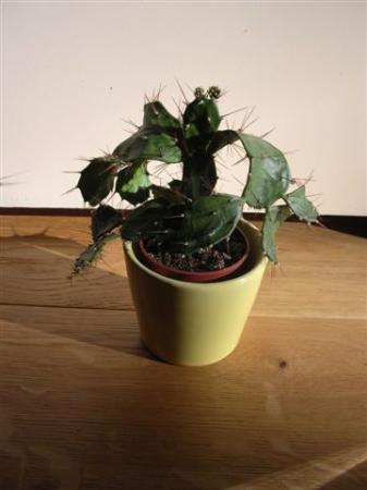 Ik denk dat we het hier hebben over de Opuntia brasiliensis. Normaal hebben we hier te doen met een cilindrische stam, zijtakken plat tot rond en de zijscheuten zijn geheel bladachtig. Waarschijnlijk is deze dus gestekt, bij u of in de kwekerij , door middel van "bladstekken". En inderdaad, het plantje heeft dorst of heeft het te warm :-)