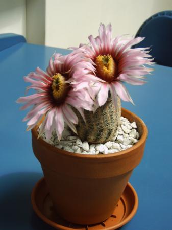 Ik vrees dat het bij gissen en missen blijft voor de naamgeving van deze plant.Het kan ook Echinocereus pectinatus zijn. Mijn " geillustreerde encyclopedie ( van Rod & Ken Preston-Mafham )beschrijft de bloem van pectinatus als volgt : " rozeachtig tot lavendelkleurig met kastanjebruine tot witte keel "