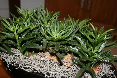 De kans is groot dat hij: Kalanchoe x kewensis heet (een kruising tussen K. flammea x teretifolia). Veel licht en weinig water en in de winter nog minder, maar niet helemaal drooghouden. groet harry