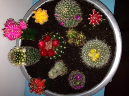 Mijn vriendin heeft sinds vier weken geleden een bak met meerdere cactussem (gekleurde,