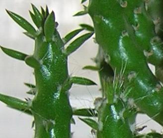 soort. De plant heeft blaadjes, die weliswaar snel afvallen, maar dat geeft aan dat het geen cactus is. Als er wit melksap komt uit een beschadiging, dan is het een Euphorbia.