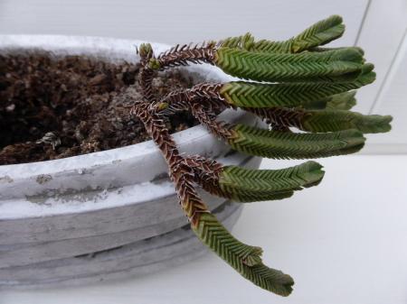 Dit 'schoenveterplantje' heeft geen afgestorven onderkant, maar wordt gewoon kaal aan de basis, wat heel normaal is. Als je dit een naar gezicht vindt, plant dan het geheel in een diepere pot, zo, dat het kale gedeelte onder de potgrond komt.