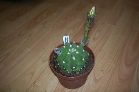 Ik heb deze cactus laatst gekocht. Ik heb nog geen bloemen kunnen ontdekken, maar er komen wel witte wollige bloemknoppen(?) aan, die later bruin worden. Eentje is er na een tijdje af gevallen, maar de grootste zit er nu al zeker een week of 3 aan.