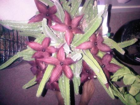 In de zomer staat hij buiten. Wat de wilderige groei veroorzaakt Weet ik niet. Mijn andere stapelia's groeien wel recht omhoog.