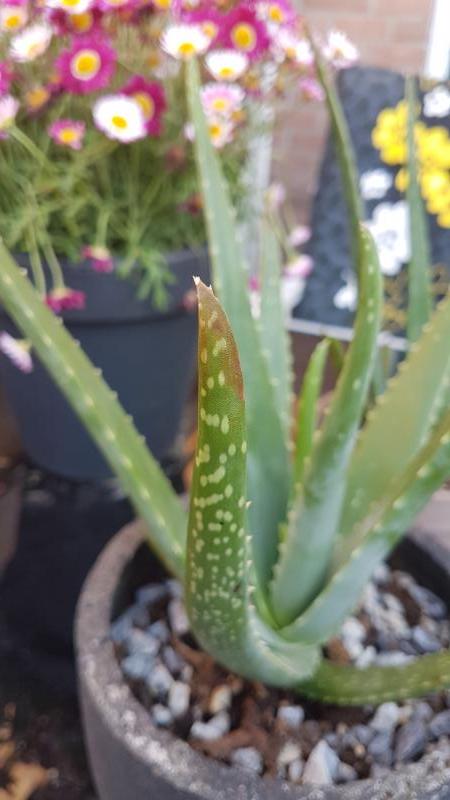 De uiteinden van de aloe vera beginnen bruin te worden. Het lijkr alsof dit steeds wat erger word. Te veel water kan het haast niet zijn lijkt me ik laat de grond altijd opdrogen. Verder ziet ie er goed uit, mooi groen en erg stevig.
