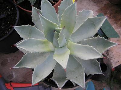 De door mij getoonde Agave potatorum (laat ik het daar maar op houden) meet nog slechts 12 cm Ø tussen de spitsen. Mijn kas van 30 m2 staat 's zomers grotendeels leeg, dus kan ik daar mooi de succulenten houden. Het wordt zo langzamerhand wel tijd om het schermdoek te verwijderen.