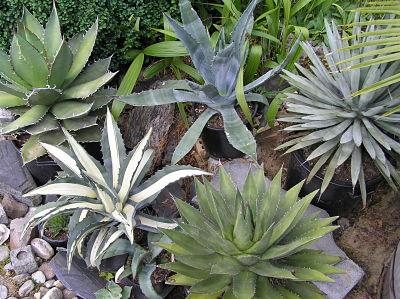 achteraan: Agave titanota (60cm), Agave americana, Agave macroacantha (60cm)