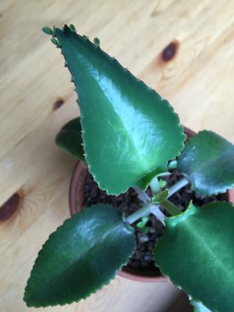 En er is nog een versie van, met lancetbormige blaadjes, lang en dun, hier zitten de jonge plantjes aan het uiterste puntje.