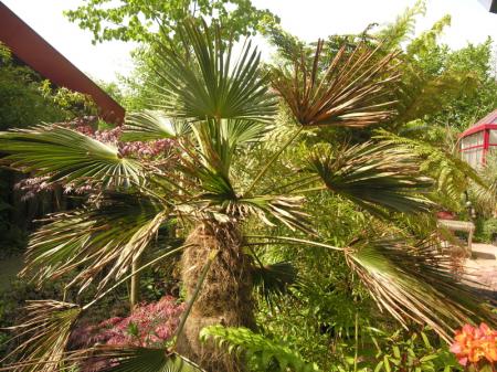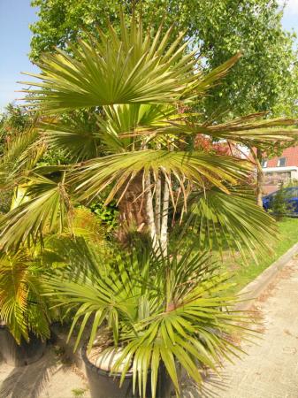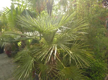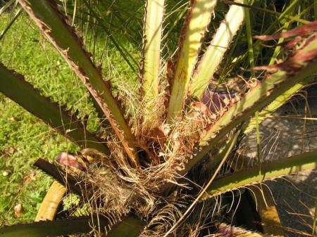 Een 'gewone'Chamaerops met slechts lichte bladschade in de nieuwgroei.