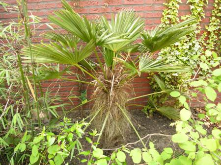 Chamaerops humulis 'Cerifera' geen centje pijn. Heeft evenals de Butia tijdens de tweede en volgende periodes met strenge vorst binnen gestaan.
