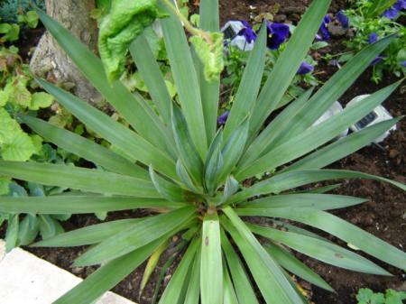 Hier nog even in detail. Deze senior zaailing Trachy F. was in februari 2009 uit nood in de volle grond geplaatst, deze was namelijk bij de kweker onderhevig geweest aan hevige vorst, had toen binnen gestaan. Was weinig van over. Tot op de dag van vandaag weinig beweging in te krijgen, maar toch... de speertjes groeien nog wel iets.