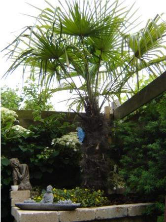 Een van de twee Trachycarpus Fortunei. Dit exemplaar heeft momenteel veel lelijke bruine punten, maar heeft inmiddels al wel gebloeid. De andere is er geheel ongeschonden uitgekomen, maar heeft in ruim vijf jaar nog nooit gebloeid.