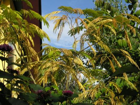 Het blad van Albizia julibrissin 'Ernest Wilson' vergeeld nu in snel tempo. Dat lijkt me wat voortijdig. De plant heeft dit seizoen flink schot gemaakt en de hoeveelheid blad zou deels de vroegtijdige bladval kunnen verklaren. Bij de varieteit 'Boubri' die ook flink is gegroeid, heeft dat echter weinig invloed op de conditie van het gebladerte. Verschil in standplaats kan ook de oorzaak zijn, de Ernest Wilson staat in de luwte van het huis op het Zuidwesten en ontvangt daardoor minder neerslag. Ik heb dat wel bij tijd en wijle met de gieter aangevuld.