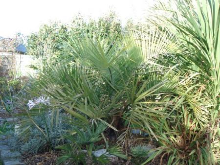 Ik heb mijn Butia capitata dit voorjaar in de achtertuin van mijn nieuwbouwhuis geplant. Hij werd echt te groot en onhandelbaar in de pot. Tien jaar geleden als plantje uit een frans tuincentrum. Na drie jaar de speer er uit gevroren, maar sindsdien, na een traag herstel, een goede groei doorgemaakt. De top van de speer is nu 210 cm hoog. Hij staat tegen een zuidmuur in goed doorlatende zandgrond. De wortels dek ik af met houtsnippers zoals ik dat bij al mijn exoten met veel succes toepas. Ik zoek nog een plaatje perspex om de plant droog te houden komende winter. Hij heeft in de pot al een keer -17 overleefd (wel droog onder een afdak. Maar hoe heeft hij het gedaan afgelopen jaar? Na een top van zeven bladeren in 2008 heeft hij sinds de aanplant in juni slechts 2 bladeren aangemaakt. Maar wel een enorm solide en grote speer ontwikkeld! Ik ga er van uit dat hij flink in het wortelgestel is aan het investeren. Ik ben zo benieuwd wat me dit volgend jaar gaat opleveren. Iemand iets dergelijks al een meegemaakt? Maar dan wel even goed de winter door krijgen. Even een avondfoto toegevoegd.