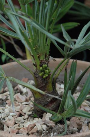 Met betrekking tot de oorspronkelijke vraag. Volgens mij is dit een Chamaerops vrouwtje en zien we de zaadvruchten in aanleg. De bloei is al geweest. Mannelijke bloeiwijzen verschrompelen tot een onaanzienlijk bruin restant. Of zich uit deze zaden in aanleg kiemkrachtig zaad ontwikkelt, hangt in de eerste plaats ervan af of ze bevrucht zijn. Ik heb bij mijn Chamaeropses nog geen zaadrijping meegemaakt.