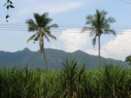 nog kleine palmachtigen in een strookje langs de weg.