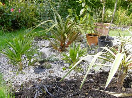 In de midden een Cordyline die elk jaar heelaas afsterft en weer uit de kluit nieuw komt.