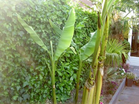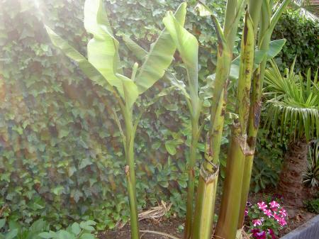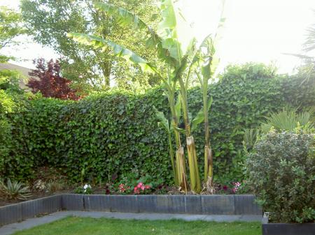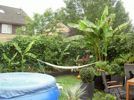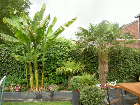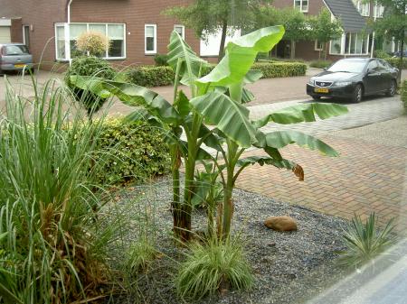 Die musa's staan inderdaad prachtig(die palmen ernaast natuurlijk ook),die van mij zit nu ook al rond de 3m.Zonder bladschade in volle grond is onmogelijk,in de natuur is het niet anders,ik spreek eigenlijk maar van schade als een blad is afgeknakt door de storm,voorlopig dit jaar nog niet gebeurd.