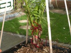 Dit is een experiment voor mij , net zoals een washingtonia robusta die in de volle grond staat. Hij heeft houtsnippers rond om de voet. Er gaat een lichtsnoer onder aan de stam tot een paar keer rond gewikkeld bij het groeipunt. En er is een hele constructie om heen gebouwd met zeil erover om hem droog te houden.