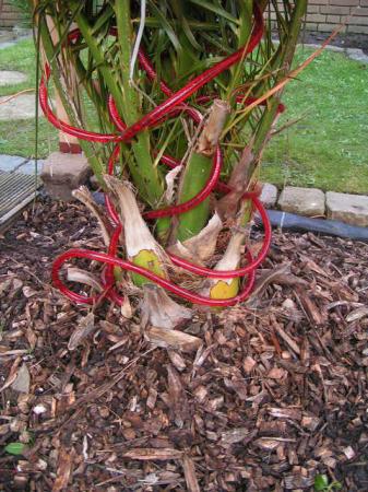 Ik heb mijn Phoenix samengebonden, vliesdoek rond gedaan, een een grote pvc buis rond gezet. Deze is onderaan en bovenaan wel open voor wat verluchting. Het geheel is wel nog samengedrukt zodat ik eigenlijk niet goed weet of het wel goed is voor de plant. Want als de bladeren tegen de buis zitten, zijn deze sneller beschadigd, of niet?