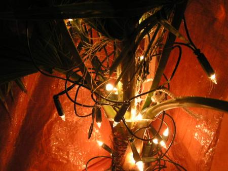 Omwille van de aangekondigde vorst (-4° tot -7° in het binnenland van Belgie) van de voorbije week bracht ik kerstverlichting (zoals Robbin ook doet) aan rond mijn phoenix canariensis. Na die paar nachten met kerstverlichting merkte ik dat de bladeren van de canariensis precies een beetje verdroogd waren.