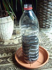 doorgesneden plastic fles waar ik gaatjes in geboord heb, beetje