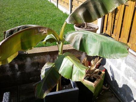 Ik weet niet waar hij van de winter heeft gestaan, maar de eerste zonnestralen zijn vaak funest, dus langzaam van een schaduwrijk plekje naar de zon verhuizen. Btw, laat je die nu al buiten staan? Ik zou zeggen, kijk maar uit met nachtvorst, want dan is het echt gedaan met je banaan.