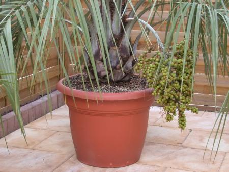 Mijn Butia na de warme zomer van 2006 (foto okt. 2006). Toen nog als kuipplant. Voorjaar 2009 in de volle grond geplaatst, de afgelopen 2 koude winters niet overleefd (zonde! Had um al 12 jaar). Ik heb de vruchten gegeten, waren heerlijk, beetje kaki smaak (als jullie die vrucht kennen), heel vlezig. Kan me alleen niet meer herinneren of de bloei (van deze vruchtentros) al in 2005 is begonnen of toch pas in 2006.