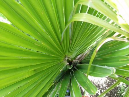 Het laatste blad van vorig jaar had al bijna geen steel, maar het eerste blad van dit jaar ontvouwt zich al in de stam en de nieuwe speer die er aankomt is nog sneller.