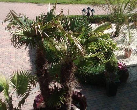 uitzicht vanaf boven.. je ziet dat mijn trachyucarpus fortunei beschadigd was door de kou... hij had voor de zomer daarom weinig bladeren.... nu september is hij behoorlik wat gegroeid en heeft bijna een mooi volle blader kroon...
