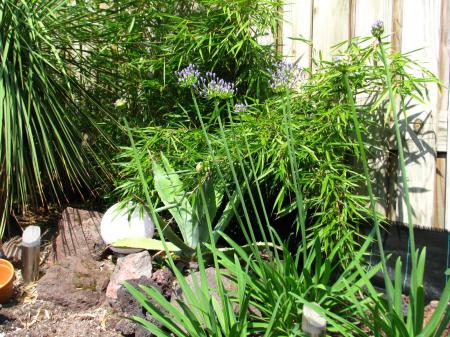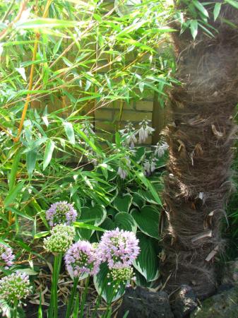 Verscholen tussen de bamboe en de palm staat nog een hosta
