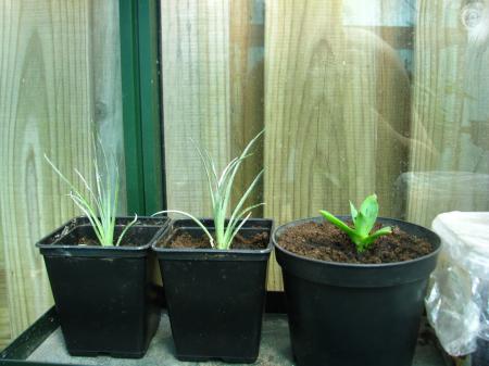 De linker twee zijn garden bromelias die(volgens het kaartje winterhad tot -10) zijn.