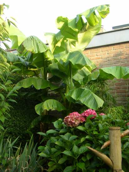 En nog een ! De Musa in de voortuin.(de boom en de struiken,zijn niet van mij ,hoor. Zo groot is mij tuin niet)